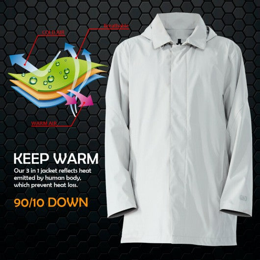 The whole jacket comes with multiple zippered pockets for safe storage of your cards or phones. And we only use the first-class YKK zippers which you will see our pursuit of details. We've got you a practical 3 in 1 jacket here would you like to take a look? It's a two-piece suit that you can wear the outer shell alone or the down jacket alone in spring and fall and you can wear both together in winter to keep warm. Isn't it practical? More to say is that the fabric is waterproof and windproof since it adopts seam taping craft to help it better seamless. The whole jacket comes with multiple zippered pockets for safe storage of your cards or phones. And we only use the first-class YKK zippers which you will see our pursuit of details. Plus there is a detachable hood which can be adjusted with a drawstring and you can remove it when you don't have one. It's so practical a jacket that features a simple business style and you won't miss it. If you are looking for a practical 3 in 1 jacket don't hesitate to get it for warm! Two-piece suit with three ways of wearing it Selected fabric comes with a waterproof index that reaches up to 8000mm/H2O and moisture-penetrability of 1500g/m2/24hr Seam taping enhances its windproof and waterproof effect Filling with 90% water repellent duck down for better warm performance and which dry faster in wet environments than ordinary ones Detachable hood with adjustable drawstring Use premium YKK zippers for the whole jacket Machine washable and won�t fade easily which has passed the AATCC standard The simple business style that suits a variety of occasions Tips for Clean and Care: a. Machine wash cold and tumble dry low b. Please do not bleach iron or dry clean c. Please wash with like colors d. The highest washing temperature shall not exceed 30 ?(86?) e. Please close all fasteners before wash