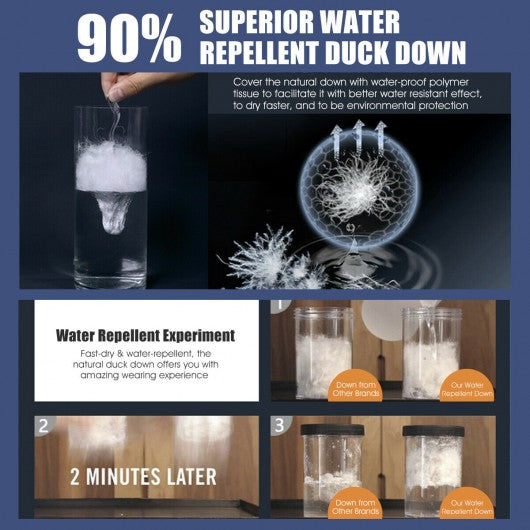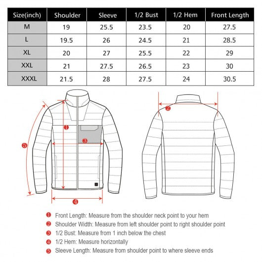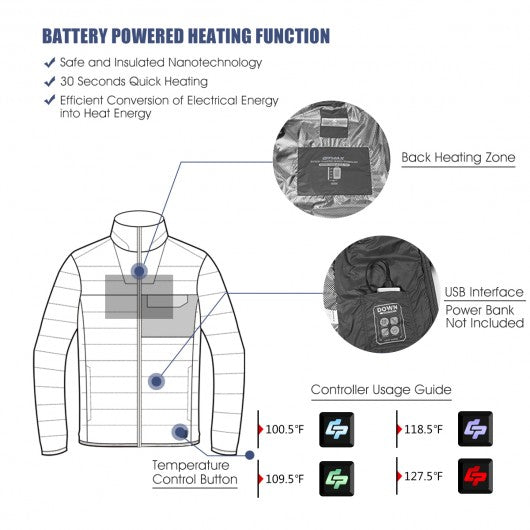 Want to dress light but warm in winter? Take a look at our this intelligence down heated jacket! Filled with more down than normal light and thin ones it absolutely keeps you warmer. The highlight of this heated down jacket is its heating function. Different from others it's powered by power bank and it won't heat itself without a power bank. And you can use the heating function whenever and wherever possible with your own power bank. For convenience a pocket is designed for taking the power bank. More than that the temperature can be adjusted by simply pressing the logo shaped button. By adopting nanotechnology it’s safe and insulating so that you can rest assured to use. The pursuit of perfection in detail ensures this heated down jacket quality guaranteed. You will be happy to have it. 100% nylon with a super soft touch and the surface is windproof and water repellent Filling with water repellent duck down for better warm performance and which dry faster in wet environments than ordinary ones Adopting advanced nanotechnology for the instant safe and insulated heating function 4 temperatures (127.5℉ 118.5℉ 109.5℉ 100.5℉) that can be adjusted by simply pressing the logo-printed button below the pocket Powered by power bank (not included) so that you can use heating function whenever and wherever possible A pocket is designed with the USB interface for placing the power bank Hand washing or gentle machine washing is required to keep its performance Filled with more down this jacket is extra warm than others Exquisitely sewn with fine stitches to keep down from coming out and uses YKK zippers Simple and practical Tips for Clean and Care: a. Hand wash cold b. Please do not bleach iron or dry clean c. Please wash with like colors d. Please wash on the gentle cycle