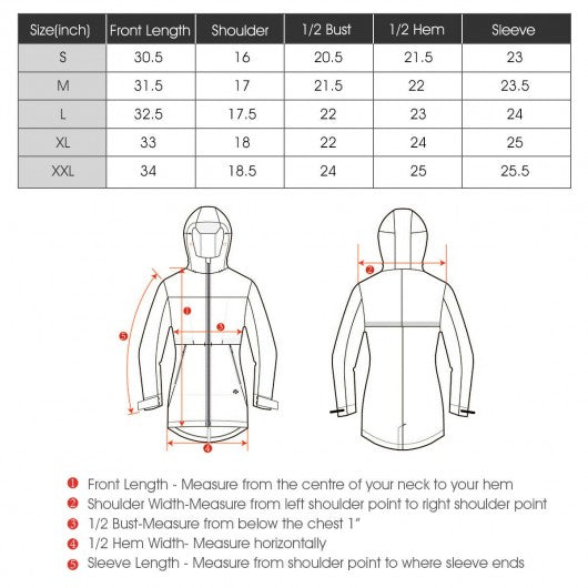 Specification: Color: Black / Navy / Gray Main material: 100% nylon Zipper: YKK Breathability index: 2000g/?/24 hours Waterproofing index: 8000mm/H2O Weight: 1 lbs Size: S / M / L / XL / XXL Size guide (inch) S-Front length: 30.5" 1/2 Bust: 20.5" 1/2 Hem: 21.5" Sleeve: 23" Shoulder: 16" M-Front length: 31.5" 1/2 Bust: 21.5" 1/2 Hem: 22" Sleeve: 23.5" Shoulder: 17" L-Front length: 32.5" 1/2 Bust: 22" 1/2 Hem: 23" Sleeve: 24" Shoulder: 17.5" XL-Front length: 33" 1/2 Bust: 23" 1/2 Hem: 24" Sleeve: 25" Shoulder: 18" XXL-Front length: 34" 1/2 Bust: 24" 1/2 Hem: 25" Sleeve: 25.5" Shoulder: 18.5"