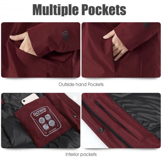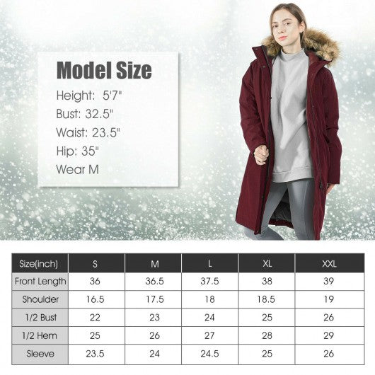 Women's Hooded Long Down Coat with Faux-fur Trim-Red-XL