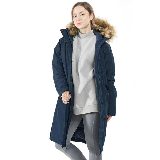 Women's Hooded Long Down Coat with Faux-fur Trim-Navy-XXL