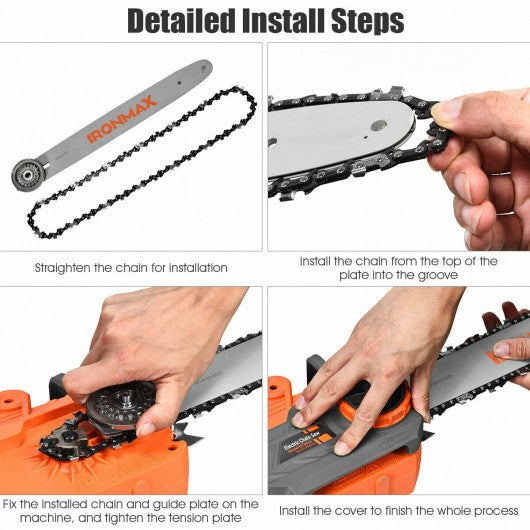 This electric chain saw will be your best assistant in rebuilding hard wood. Cutting speed of this chain saw is up to 13 m/s and its idling speed is 7000 rpm. Powerful motor with 16-inch sprocket tipped bar and chain can cut through branches and wood with ease. The oil tank can hold 340 ml liquid at one time. The right side of the chain saw has a visible oil tank window you can know the amount of oil in the tank easily without opening the cap can effectively prevent oil spill out. The long and comfortable grip provides sufficient cushioning force to reduce shock. The auxiliary handle in the middle part is more convenient for users to grasp and force and is more convenient for cutting. The total weight of the chain saw is only 11 lbs which is easy for users to carry. If you are looking for the electric chain saw don't hesitate to buy it! Let's explore the forest together! Powerful motor can cut through branches and wood with ease Automatic oil lubrication can keep the proper lubricant on the chain for continuous cutting The oil tank can hold 340 ml liquid at one time The right side of the chain saw has a visible oil tank window Comfortable grip provides sufficient cushioning force to reduce shock Auxiliary handle in the middle part is more convenient for users to grasp and force Large sawdust design for fast chip removal to operate smoother Brake can stop running quickly A sheath to wrap the blade for safety Baffle and switch-on safety lock keep safe Total weight is only 11 lbs for easy carry Side-mounted chain tension system allows for quick adjust the chain Wire plugs are UL certified and the whole product is ETL certified for your safety