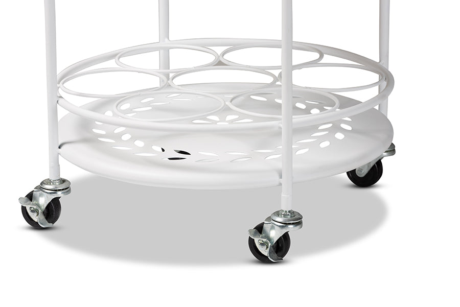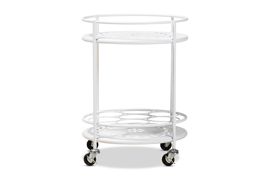 Introduce a lovely accent of industrial design to your space with the Dallan kitchen cart. Made in China, this cart is constructed from metal featuring a brilliant white finish. The lower shelf offers seven wine bottle holders to organize your collection, while the rounded tabletop features a protective guard rail to protect display items. The Dallan will arrive fully assembled and features floral cut-out for a unique, elegant touch. A fantastic pedestal for beloved assets, the Dallan kitchen cart is a remarkable addition to any dining space.