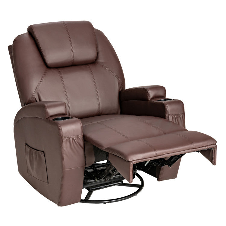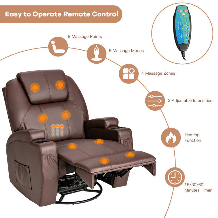 Are you tired of sitting on the normal sofa? This massage recliner chair will bring you a different experience. Designed with 8 massage points low/high massage intensity 4 optional parts 5 massage modes and 3 timing modes this recliner chair can render you a customizable massage experience to eliminate fatigue. Better yet the separate heating function for the lumbar further releases your stress and pain. Fully overstuffed chair coupled with an extendable footrest will bring a comfortable feeling to let your body relax thoroughly. The adjustable reclining angle 360°swivel design and rocking function can meet your needs for different occasions such as reading watching TV taking a nap chatting with friends in all directions etc. Also 2 side pockets 2 front pockets and 2 cup holders are convenient for you to put items. If you are looking for such a product do not hesitate to take it to your home! Note: The chair is divided into two boxes and delivery time may vary Includes 2 massage intensities 4 massage parts 5 massage modes 3 timing modes 8 massage points to fully relax your entire body Lumbar-oriented heating function for better relaxation 360°swivel function brings great convenience Reclining and rocking function to satisfy your various demands Skin-friendly PU leather and overstuffed padding for ultimate comfort Side and front pockets cup holders to store essentials for easy access Durable frame for superior stability and sturdiness Convenient to operate with the remote control Easy to assemble under the guidance of the clear instruction Installation guide