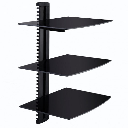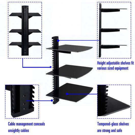 3 Tier Dual Glass Shelf Wall Mount Bracket Under TV Component Cable DVR/DVD