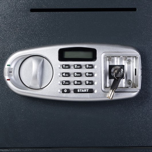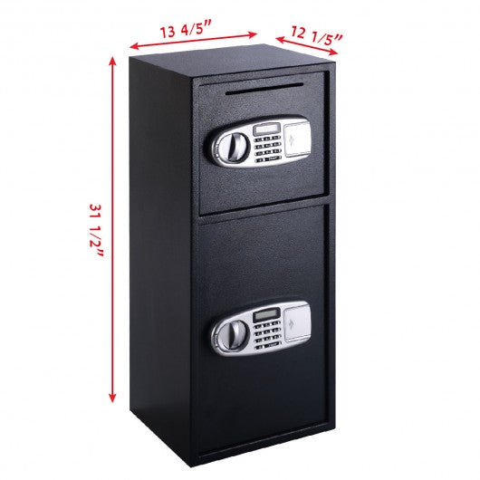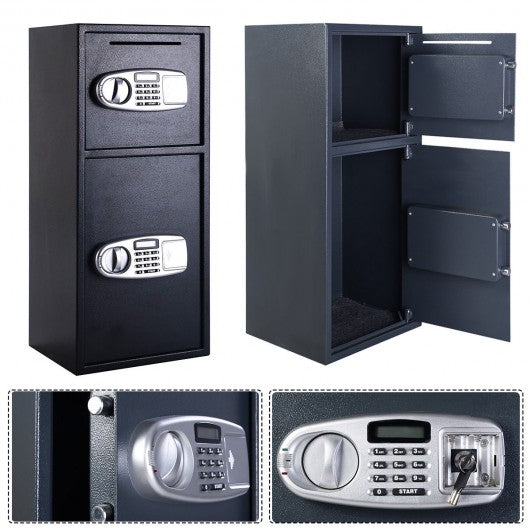 This digital safe box with double doors is the best safe box to help you store your item. It can keep cash jewelry guns documents and other valuables safe. The safe is built with a heavy duty steel construction that can serve you a long time. The safe has an easy access deposit slot to leave deposits at the end of the day. It is an excellent choice for office home stores restaurants motels churches or any type of business that uses cash transactions. Easy to operate and program Includes 2 separate safes for added security An easy access deposit slot makes it simple to leave deposits at the end of the day Opens with secret PIN code or included keys (4 free keys) Simple programmable electronic lock Code can be changed infinitely Runs on AA size (1.5 V) batteries Constructed with solid steel to resist hand and mechanical tool attacks Powder coated interior and exterior Constructed of extra thick solid steel
