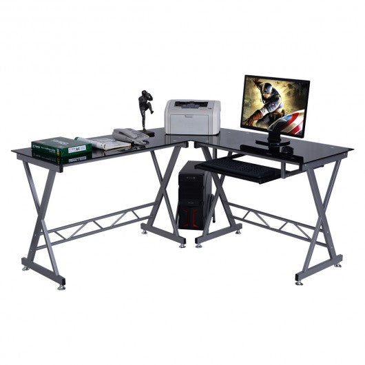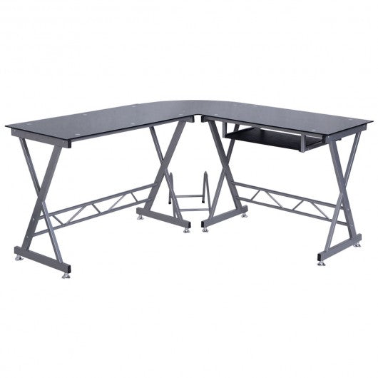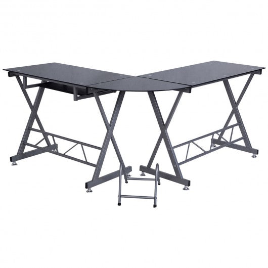 The L-Shape computer desk which is a piece of furniture with a simple design has the large glass top and the corner wedge to spread your reading and writing provding you with a unmatched convenience. The workstation features a smooth slide-out keyboard shelf and generous glass top. As a full-size desk the writing desk is large enough for your work. You can comfortably spread your workstation across the spacious surface. Sturdy frame that is designed in an edgy architectural look to support all your office essentials. This desk provides additional space to work without making a room look clunky. It's more than a furniture but a stylish decor if you take it home. Brand new and high quality Ideal for business or personal use Provide large storage space Slide out keyboard tray Assembly needed with Assembly instruction (all necessary hardware included)
