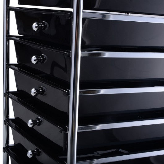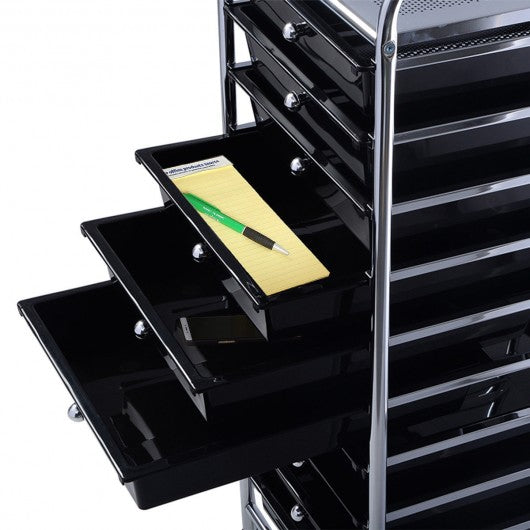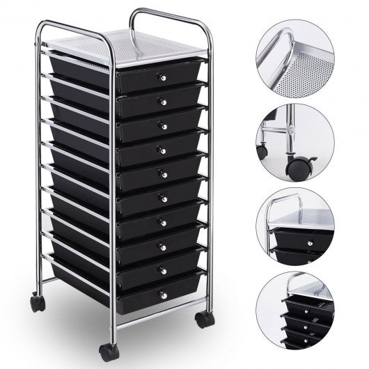 The rolling storage cart which is with 10 drawers is ideal for getting your work files in well organized and save the space easily in your office home school or garage. The cart with rolling makes it possible for you to keep your daily supplies in order wherever you decide to put it. It is of chrome plated steel framed and 10 removable pp drawer organizer. The cart can be put anywhere you want and saving space at the same time as it is compact designed.The attractive low-profile modern black and chrome design makes this unit a practical addition to nearly any room. Buy yours today! Brand new 10 drawer storage cart Four caster wheels 2 locking Ideal for storing small tools in office home school garage Chrome plated steel frame Four caster wheels Easy assembly