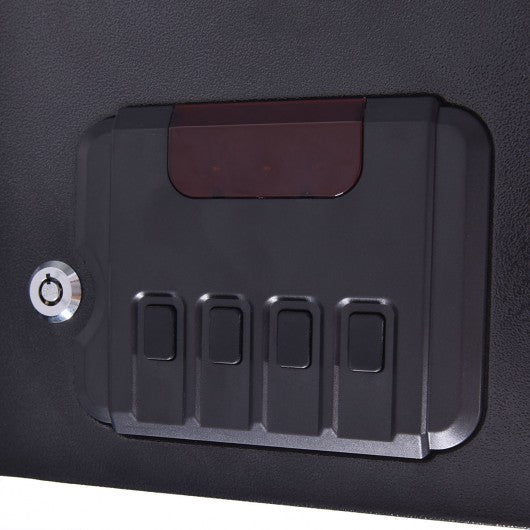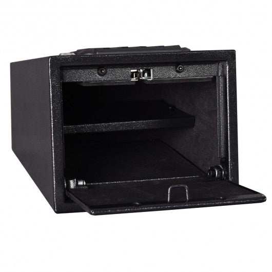 The pistol safe features Alarm-U the tamper and motion sensitive alarm that deters theft and keeps your family safe. The whisper quiet yet quick button key pad provides easy access. With a programmable e-lock and spring loaded drop down door this unit is easy to use as well as very secure. The safe is made of heavy steel and can hold 2 pistols. The safe unlocks with 4-button code or key; it can easily program personal code in seconds. The shelf in the safe is removable for maximum organization. Thanks to the premium and removable padding your items can be kept safe and complete. The safe has hidden predrilled holes for easy securing to wall or floor with anchors & bolts. It’s DOJ approved. All-steel safety box secures smaller weapons Unlocks with 4-button code or key; easily program personal code in seconds Spring-loaded door flies open immediately upon unlock for quick access Hidden predrilled holes for easy securing to wall or floor with anchors & bolts Backup key included Removable shelf for maximum organization Premium removable high density padding Pry-resistant hinges for extra security DOJ approved