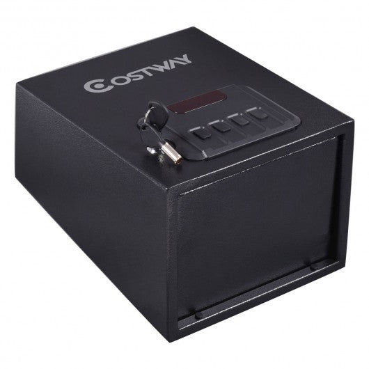 Specification: Material: Steel Outer dimensions: 12” x 9” x 5” (D x W x H) Color: Black Power source: 4 x AA batteries Package includes: 1 x pistol safe 1 x instruction 2 x rubber clips 2 x keys 4 x AA batteries