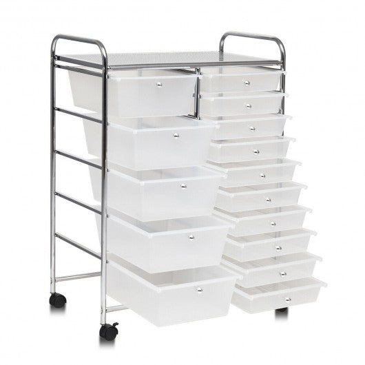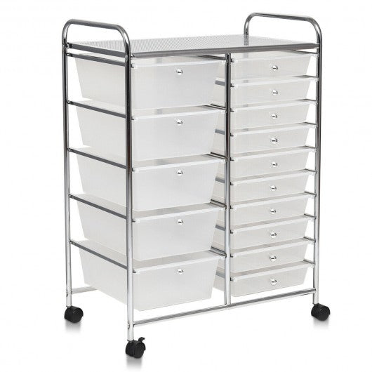 This 15 drawers rolling storage cart with 5 big drawers and 10 small drawers is ideal in your office home school and garage. Featuring a chrome steel frame and plastic drawers this 15 drawers rolling cart is durable and serves you for long time. This cart includes 5 big drawers and 10 small drawers which provide enough storage space. The colorful boxes can store plenty of items and also be a perfect decoration to living space. Equipped with 4 universal wheels it is easy to move and fix. This rolling storage cart is great for home and school use. Do not hesitate to buy one! High quality and brand new 15 moveable drawers for storage 5 big and 10 small Steel frame and plastic drawers durable and can serve your for long time 4 universal wheels (2 with locks) for easy movement and fixation Easy to assemble Colorful boxes for storing items and also a decoration to living space Ideal storage box for home office and school use