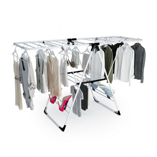 This portable laundry clothes storage drying rack is an ideal choice for families to have the clothes well-organized. Made of rust-proof coating steel and sturdy plastic joints the drying rack is durable and lightweight. It is easy to use and can be opened and closed quickly. The two side wings can be lifted independently and can be adjusted in different heights and positions. It can be easily folded away for compact storage. With this terrific drying rack a lot of unnecessary trouble would be saved. Don't hesitate to add it to your cart. Brand new and high quality Portable & multi-functional clothes rack No assembly needed 2 tiers of drying space Each wing 6 dryer tubes Flat and angled surfaces for drying Foldable design for easy storage and space saving
