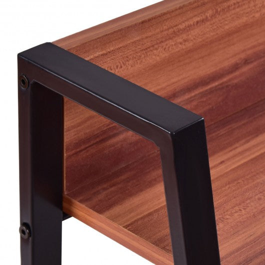 Specification: Color: Walnut Material: Steel + MDF Overall size of this item: 21.5" x 14" x 35.5" (L x W x H) Product weight: 17.1 lbs Max. loading weight capacity: 220 lbs Distance between each shelf: 13.5" Package includes: 1 x Display shelf