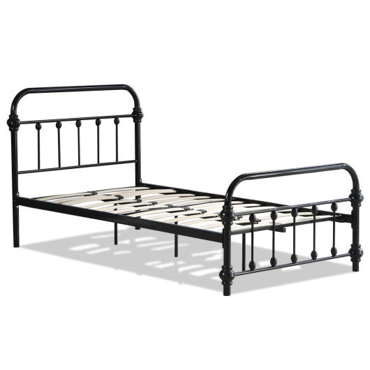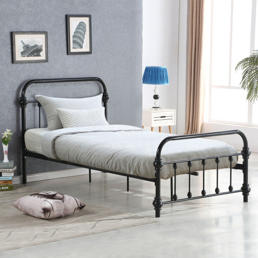 This is our brand-new twin size steel bed frame which is made of hard-wearing heavy-duty stainless steel and premium craftsmanship. The bed frame is stable and durable with a great load-bearing capacity of up to 330lbs. Its retro and elegant design blends well with any decoration style you have in your home. What's more our steel bed has large under-bed storage which saves more space and helps you keep your room organized and tidy. When you come home tired from a busy day lay down in our twin-size bed and relax. It's a good choice for you. Don't hesitate to buy it now! It is equipped with a stable and durable steel frame The artistic and elegant design makes it a perfect decoration for any bedroom Extra 3 sturdy supporting legs for added stability and durability Large storage space underneath the bed frame High load-bearing capacity Easy to clean and use The standard height is suitable for standard size bed skirts Great for residence bedrooms dorms children's rooms etc. Wooden slats can curve downwards and you can adjust them to fit your body and your sleeping position Easy assembly required