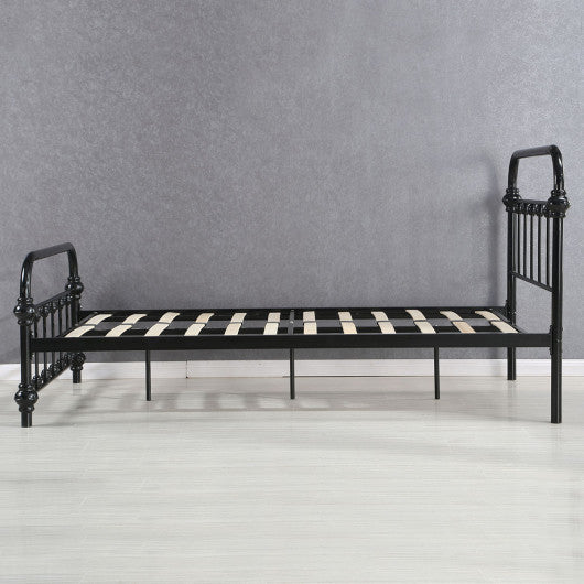 Specification: Color: Black Material: Wood + steel Weight: 42 lbs Weight capacity: 330 lbs Product size: 78" x 41.5" x 40" (L x W x H) Inner mattress size: 75" x 39" Wood strip: 19" x 2" Package includes: 1 x Black twin size bed frame 1 x Instruction