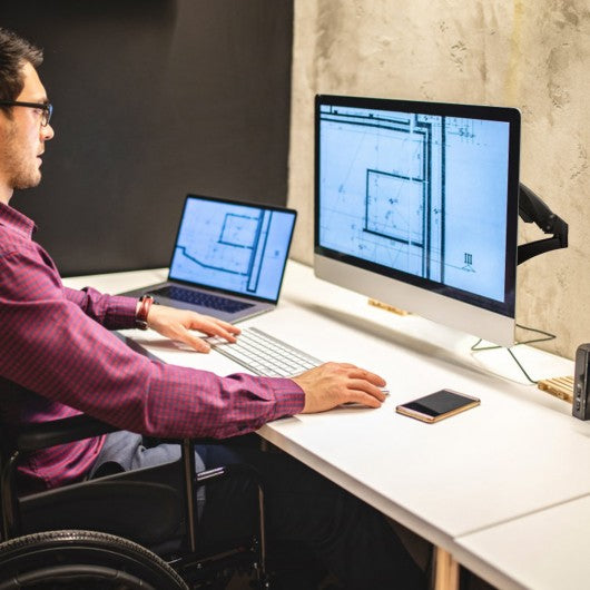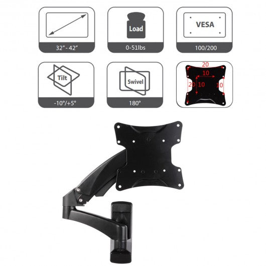 This hydraulic arm monitor bracket fits most monitors LCD plasma panel TV and flat screen. Smooth operation provided from premium hydraulic arm with durable gas spring inside means you don't have to pick up your monitor to adjust it. Let the hydraulics do all the work and switch from sitting to standing in an instant. Engineered for better ergonomics to increase viewing comfort and help reduce eye back and neck strain. Fully support monitor sizes from 32"- 42" and weights up to 51lbs. Includes 100mm and 200mm vesa mounting patterns. Don't hesitate to buy it! Strong material confirms the security of your monitors Adjustable height for different watching habits Easy lift with just a touch Cord management system hides cables which means more usable workspace and a cleaner desk Tilts from -/ +15 degrees and turns 90 degrees left/right; Rotates 360 degrees Easy to assemble