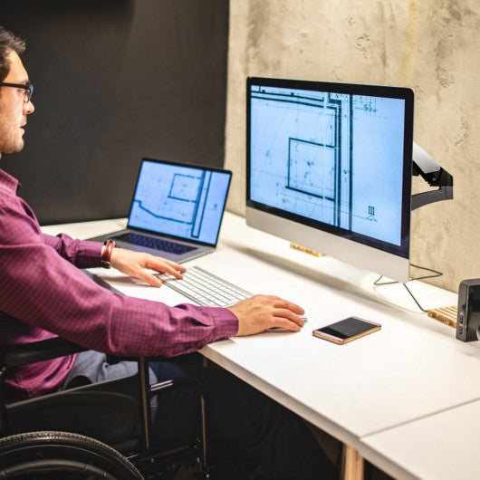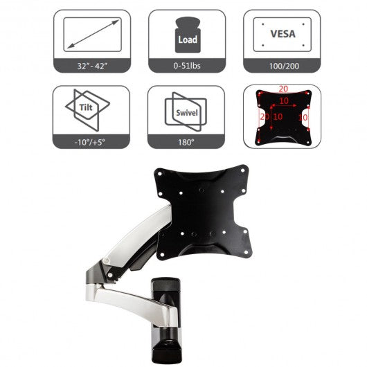 This hydraulic arm monitor bracket fits most monitors LCD plasma panel TV and flat screen. Smooth operation provided from premium hydraulic arm with durable gas spring inside means you don't have to pick up your monitor to adjust it. Let the hydraulics do all the work and switch from sitting to standing in an instant. Engineered for better ergonomics to increase viewing comfort and help reduce eye back and neck strain. Fully support monitor sizes from 32"- 42" and weights up to 51lbs. Includes 100mm and 200mm vesa mounting patterns. Don't hesitate to buy it! Strong material confirms the security of your monitors Adjustable height for different watching habits Easy lift with just a touch Cord management system hides cables which means more usable workspace and a cleaner desk Tilts from -/ +15 degrees and turns 90 degrees left/right; Rotates 360 degrees Easy to assemble