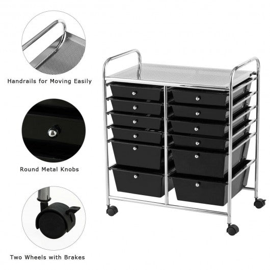 This semitransparent 12-Drawer Rolling Cart is perfect for the home classroom or art studio.   This double-line organizer features 12 easy-access drawers including 3'' height and 5'' height. It is great for paper tools accessories crafting scrap booking or home office help you to organize and make your tools and makeup in order. The semitransparent plastic drawers allow you to quickly identify contents. The sturdy steel frame and neat design makes it stable and attractive.   If you are looking for a fine Rolling Storage cart it will be your excellent choice to buy!   High quality and brand new 12 moveable drawers for storage Large high work surface/ 26.5-inches high for extra work/storage space Steel frame durable and can serve for long time 4 casters (2 with locks) for easy movement and fixation Drawer with handle for easy closing and opening Colorful boxes storage items and also a decoration to living space Ideal storage box for home office and school using It is ideal for getting your work and life space Assembly required with all necessary parts include