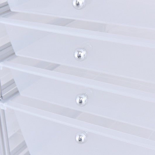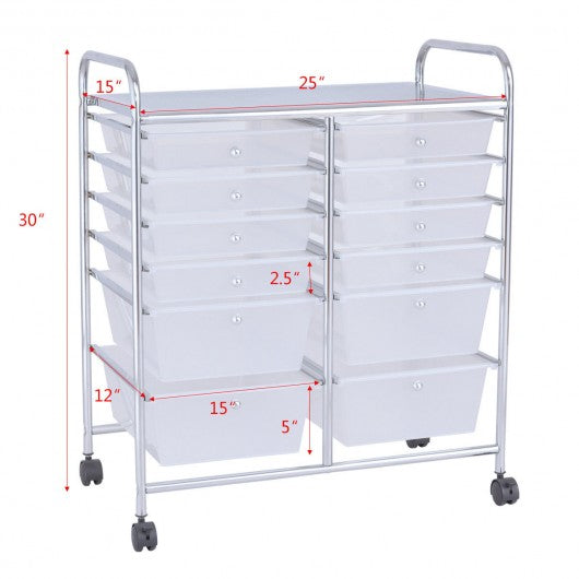 This semitransparent 12-Drawer Rolling Cart is perfect for the home classroom or art studio.   This double-line organizer features 12 easy-access drawers including 3'' height and 5'' height. It is great for paper tools accessories crafting scrap booking or home office help you to organize and make your tools and makeup in order. The semitransparent plastic drawers allow you to quickly identify contents. The sturdy steel frame and neat design makes it stable and attractive.   If you are looking for a fine Rolling Storage cart it will be your excellent choice to buy!   High quality and brand new 12 moveable drawers for storage Large high work surface/ 26.5-inches high for extra work/storage space Steel frame durable and can serve for long time 4 casters (2 with locks) for easy movement and fixation Drawer with handle for easy closing and opening Colorful boxes storage items and also a decoration to living space Ideal storage box for home office and school using It is ideal for getting your work and life space Assembly required with all necessary parts include