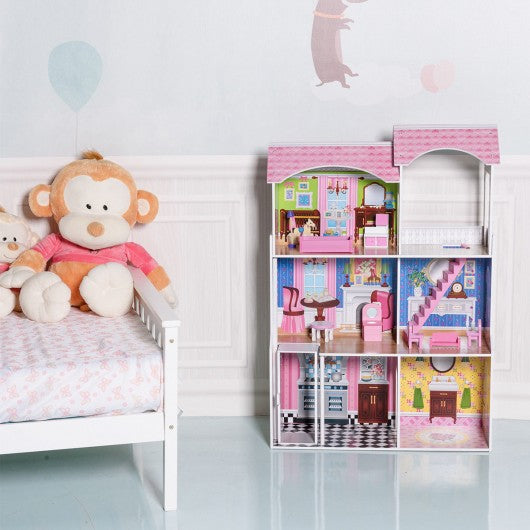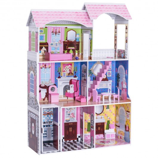 Our dollhouse is a perfect addition to kid’s playroom.This environmental friendly non-toxic paint dollhouse comes with a lot of mini furniture. The open design and tall space between floors offer easy access and can accommodate dolls up to 12" tall. It is large enough for more than one children to use and dream at a time.If you are looking for such a dollhouse for your beloved kids just add it to your cart. Made of eco-friendly MDF with non-toxic paint 3 levels 5 room and a balcony of open space 8 pieces of colorful furniture Accommodates dolls up to 12" tall Gliding elevator takes dolls between first and second floors Large enough that multiple children can play at once Open design and tall space between floors offer easy access from multiple angles Easy to assemble