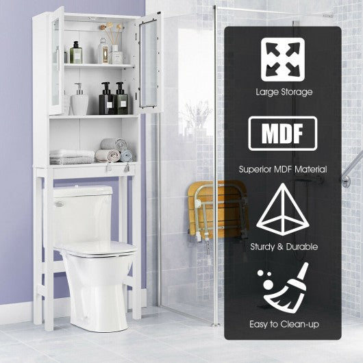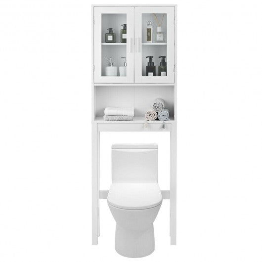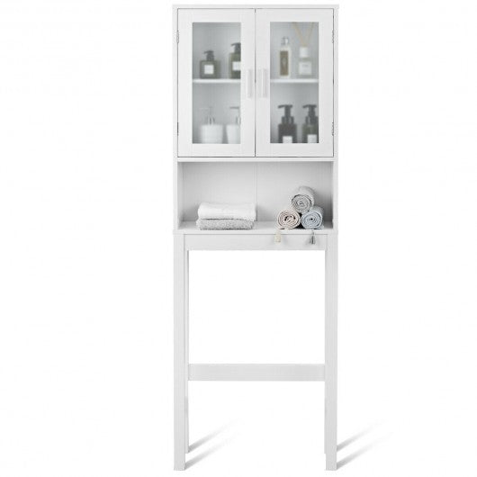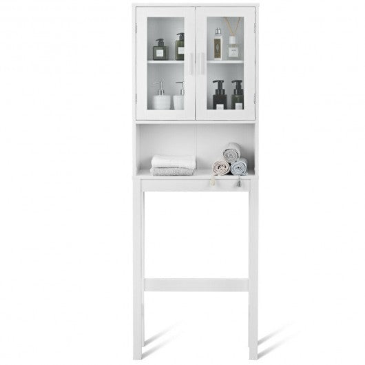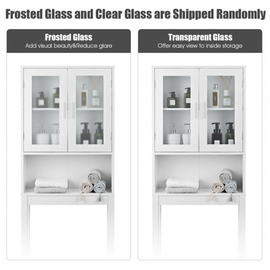 This versatile bathroom spacesaver allows you to utilize extra space for all your bathroom storage needs. Place this white bathroom space saver around the toilet and add bathroom storage space quickly and easily. Features an two-door cabinet and an open shelf for easy access storage. The cabinet provides excellent storage solutions for bathrooms with limited space. This bathroom space saver features sturdy MDF construction and its white finish ensures that it will match and accent any existing decor. It is a free standing furniture piece which conveniently fits over standard toilet tanks and adds easy storage for roll paper and other bathroom necessities. If you are looking for the bathroom spacesaver don't hesitate to buy it! Warning:Toilet Rack with frosted or clear glass are shipped randromly Brand new and high quality Elegant and sleek storage cabinet Charm and practicality come together in perfect harmony Premium MDF construction adds its durability and stability Finished in a refreshing and bright white color Allows you to utilize extra space for all your bathroom storage needs Includes a open shelf and one two-door cabinet Hidden area behind cabinet doors features two storage shelves Feature handles for easy opening and closing Fits over most standard toilets Provide excellent storage solutions for bathrooms with limited space With a wipe-clean surface easy to clean Assembly required