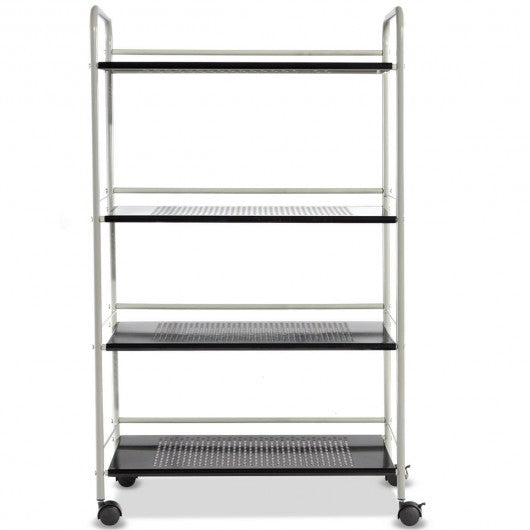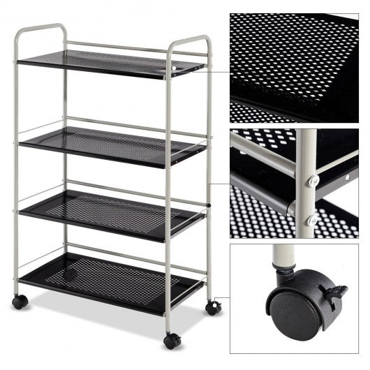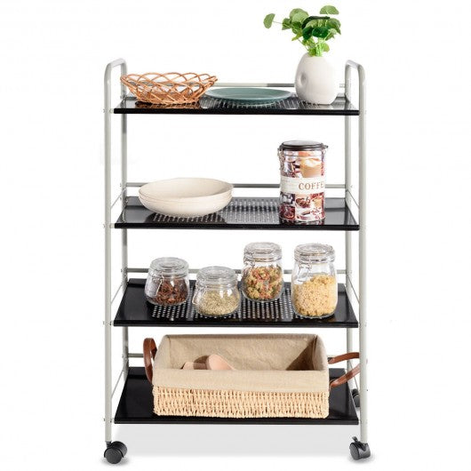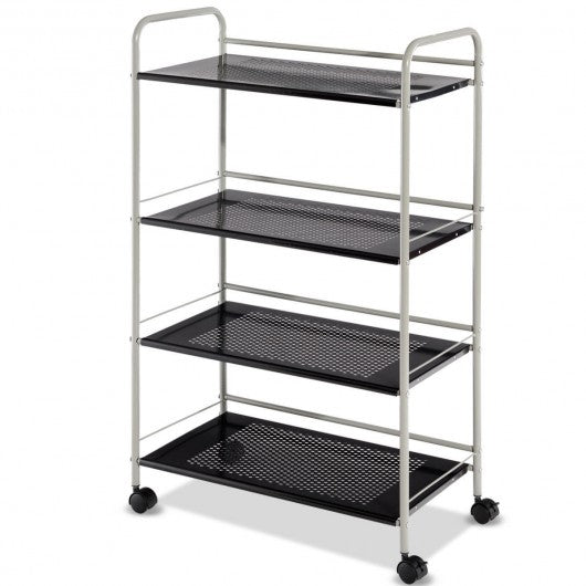 This 4 tiers storage rack with rust-resistant and heavy-duty steel construction provides a convenient solution to store your daily stuff. With 4 shelves it can provide large capacity and stable frame to hold most items. You can organize and keep everything handy and in order bringing you a clean and neat living space. Guardrail design protects the items from falling. It is great for all places such as office garage bathroom and kitchen. This pragmatic storage cart is an ideal addition to your house. Do not hesitate to buy one! High quality and brand new 4 tiers storage rack Rust-resistant and heavy-duty steel construction super durable Provide large storage space 4 casters (4 lockable) for easy movement Guardrail design protect the items from falling Handle equipped easy to push the cart Organizes and keeps everything handy and in order Ideal for office garage bathroom and kitchen Easy to assemble