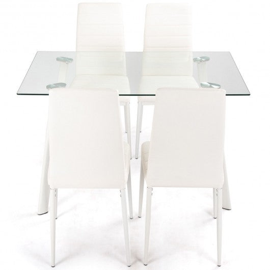 This is the modern and beautiful dining table set which combines quality and style into one and serves the idea of simplicity and contemporary living. It includes one tempered glass top table and 4 PVC leather chairs that make it looks fantastic in any room. Superior tempered glass table top has good heat resistance and durability and is easy to clean. With ergonomically designed high back and softly padded seat you will gain extra comfortableness when you lean on the chair. Besides the dining room this table set can also be used at home office garden restaurant event and conference room etc. If you are looking for a dining table set like that. Don't hesitate to buy it. Brand new and high quality Sleek design with modern appearance coordinates with other elements Tempered glass table top good heat resistance and durability Curved edge of table enhance security prevent injuries Ergonomic high back design offer extra comfortableness No-mar rubber feet keep them from sliding and scratching hardwood floors Ideal for home kitchen office garden restaurant etc Set includes 1 table and 4 chairs Easy to clean Simple assembly required