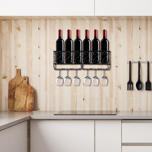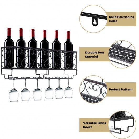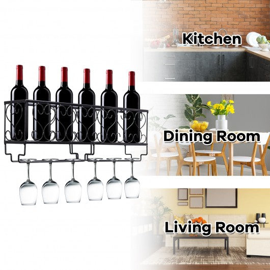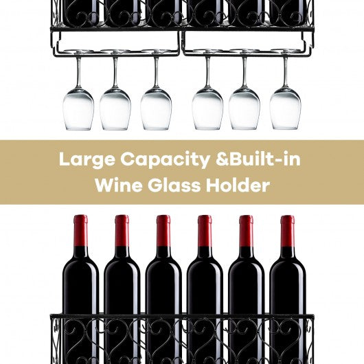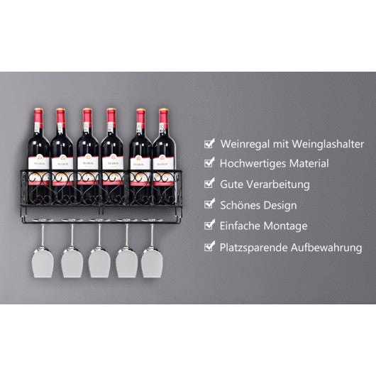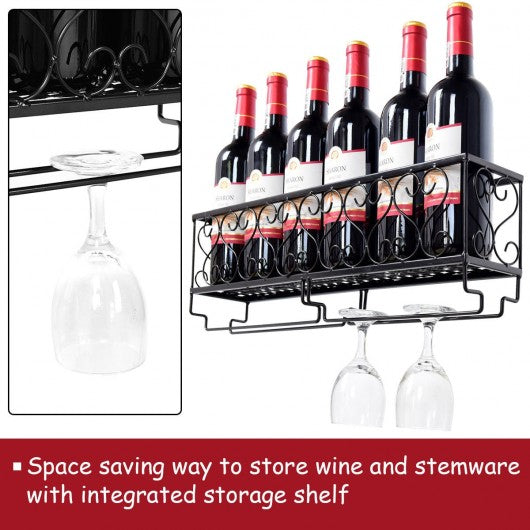 This high quality and stylish wall mounted wine rack is a space saving way to store wine and stemware. In general wine rack holds 5-6 bottles of wine and stemware rack holds 4-6 wine glasses. The attractive design helps decorate your home and wall mounted design helps save space. Metal construction for durability that ensures long time use. What's more it is easy to install and it matches kitchen dining room living room wine cellar or bar you can install it wherever you want. Great gift for any wine lover including yourself. If you are looking for such a wall mounted wine rack please don't hesitate to buy one! Brand new and high quality Made of premium iron material sturdy and durable Space saving way to store wine and stemware wall mounted design Decorate your home stylish and chic design Make your living room or kitchen more impressive versatile Wine rack holds 5-6 bottles of wine and holds 4-6 wine glasses No assembly required but easy to install