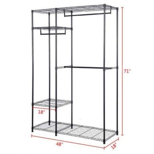 With large storage capacity this durable and adjustable metal wardrobe designed for multiple purposes is the perfect choice to keep your house in well organized. The portable hanger is where you can hang clothes and store sweaters hats gloves purses shoes and even totes. Designed with three hanging rods plus 3 large shelves and 2 small shelves this metal wardrobe rack is a great solution for any room in your home. Featuring top-grade steel and fine workmanship it porvides good hand feel and a long lifespan. A concise and practical clothes rack is necessary for each household. If you are looking for extra space to store your clothes and shoes don't hesitate to buy it! Brand new and high quality Large storage capacity Adding more space for your clothes and accessories Quick and easy installation Keep your home neat and organized