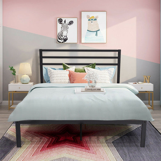 This modern studio metal bed frame with headboard would be a good choice for your bedroom. It features wooden slats. Padded non-slip tape is added to the steel frame for noise-free use and prevents your mattress from moving. The heavy duty platform bed with weight capacity up to 400 lbs provide strong support for your memory foam latex or spring mattress. The 14 inches height with 12 inches of clearance under the frame will provide plenty of under bed storage space. This modern studio metal bed frame is great for residence bedroom dorm school kids student children room. If you are looking for such product don't hesitate to buy it now! Brand new and high quality Modern style Durable metal construction Headboard and frame combine for stylish mattress support Noise-free use Non-slip tape 14" from the floor to the base of bed Enough storage space The weight capacity up to 400 lbs Easy to assemble Great for residence bedroom school and student dorms childrens room