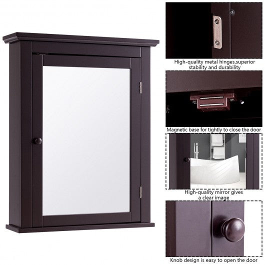 This wall mounted mirror cabinet combines stylish and functionality to create a modern home furnishing which is ideal for use in bathroom and bedroom. With brown finish elegant and simple appearance this mirror cabinet will well match with your furniture in your home. It can perfectly blend in various decoration styles and leave your guests a deep impression. Featuring 2-tier cabinet with mirror this cabinet adds storage space to your room. It is a ideal option for small bathroom. It has sufficient space to storing and organizing linens toiletries and bath essentials like soaps shampoos body wash and more. The design of door not only hide the item but also keep moisture and dust out. This cabinet is made of thick MDF board with smooth paint waterproof and anti-corrosion which ensures durable and sturdy. So don't worry this mirror cabinet can provide long time service for your family. Don't hesitate to buy it! Brand new and high quality Made of high quality material smooth sturdy and durable It has a long service life Wall-mounted save space 2-tier cabinet add some additional storage for you Magnetic lock to hold doors shut Convenient for use Easy to maintain and set up