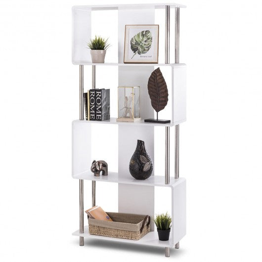 This attractive bookshelf meets the aesthetic of a practicality add a lot of interest and particular charm to any room interior. It combines with wood and metal material artfully show to an industrial character and artistic appeal feeling pure white surface the clean lines gives this bookcase a thoroughly modern fresh style. Snaking bookshelf with modern open concept design four tiers large open shelf can display your books CDs DVDs vases photo frames decorations and collectibles. It will be your best organizer to make you living room bedroom office tidy It is a good ornament that let your room full of fashion sense. If you are looking for it don’t hesitate to buy it now ! Versatile modern design Made from combination of engineered wood and steel Modern display bookcase with geometric-inspired shape 4 large-capacity storage reasonable use of space. Opening roomy shelves to display books photos decorative items and more Steel stable base firm structure and strong bearing capacity. White surface and the clean lines simple and stylish Smooth surface and edges easy to clean and maintain Practical holder and organizer Assembly requirement