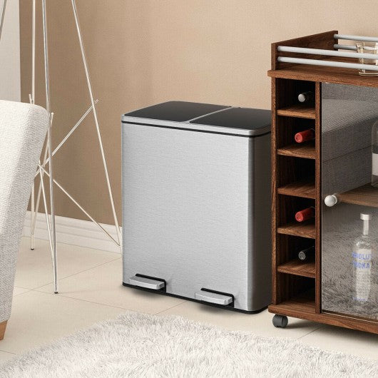 A perfect 16 gal stainless steel trash can suitable for kitchen office or anywhere you need to throw rubbish at home. It is made of stainless steel and pp which is durable and solid. Smooth surfaces are not only easy to clean but elegant silver can match your home decoration glazing treatment to help the surface of the can against bacteria and fingerprints. Both recyclable and non-recyclable rubbish are in one place with two compartments for easy sorting the two detachable bins inside can also be removed for cleaning. You don't have to worry about the inconvenience because both separate buckets have handles you can take them out easily and there are invisible handles on the outside too. Strong wide steel pedals mean cans don't have to be handled by hand you can open the lid with a simple step. Meanwhile after you release the pedal the lid falls slowly and without any noise. Bring you a quiet and comfortable environment! If you are looking for it don't hesitate to buy it! The treatment of sealing glaze can keep the surface clean better Two separate plastic buckets have handles that can be easily lifted Trash can body has invisible handle can move conveniently The cushioning mechanism of the plastic lid can not only fall slowly but also be noiseless The dual bucket design allows for better garbage sorting Stainless steel material is not only sturdy but also durable Arc-angled rectangles are not only more capacious but also safer The pedal requires very little effort to use Smooth surfaces are easy to clean