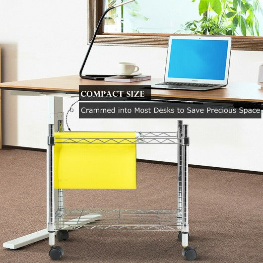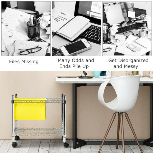 This rolling file cart is perfect organization and storage assistant in your daily office life. Constructed of steel with silver galvanizing finish the cart stands upright to last for years. The cart's four swivel wheels offer easy movement from room to room and two lockable wheels are convenient for storage. The bottom shelf carries reams of paper binders books and office materials. This versatile cart is designed for use in offices mailrooms cubicles classrooms dorm rooms and libraries. Made of high quality steel construction sturdy and durable Lightweight roll around and space-saving Effectively organize and find your file quickly A movable hanging divider to place the files horizontally or vertically Letter size and suitable for legal size folder Easy to move with 4 solid universal wheels two of them are lockable Can be used in personal workspaces home offices conference rooms libraries etc Easy to assemble