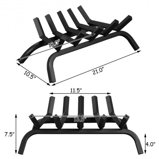 Specification: Color: Black Material: Iron Overall dimensions: 21"/18" x 10.5" x 7.5" (L x W x H) Length of front top: 16.5" Length of rear top: 11.5" Number of bars: 5 Clear between floor and crossbar: 4" Net weight: 5.5 lbs Package includes: 1 x Fireplace log grate