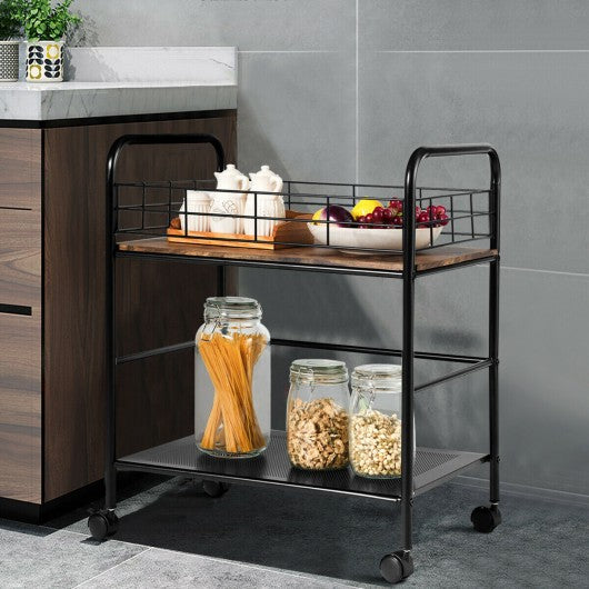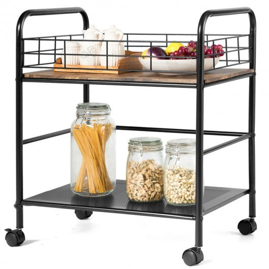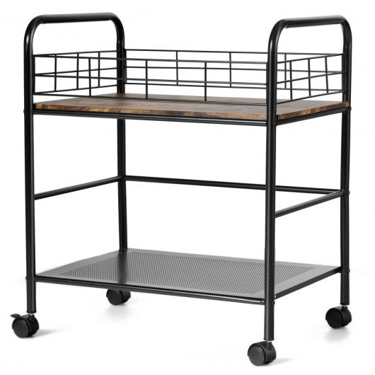 This 2-tier storage rolling cart which can help you a lot for storing and organizing your items in your home or office trimly. Coming with the industrial and concise design and satisfied storage capabilities this rolling cart will become an integral part of your home. The 2 open large shelves are advantageous to ventilated and easily cleaning. The metal frame is tightly welded for durability and stability. The 4 wheels at the bottom are convenient for you to move the cart to anywhere smoothly. You can also lock it at anywhere you want because 2 of the wheels can be locked. This versatile cart is designed for use in bathroom living room kitchen offices and libraries. If you are looking for such product don't hesitate to buy it now! Stable metal frame and premium MDF board for durability and stability 2 spacious layers allow for ample storage space Compact and lightweight design for space saving and conveniently moving The combination of wooden board and metal pipes is industrial and stylish The upper level has a fence to keep things from falling Smooth-rolling lockable wheels for easily mobility Suitable for kitchen living room bedroom office and bathroom Simple assembly needed