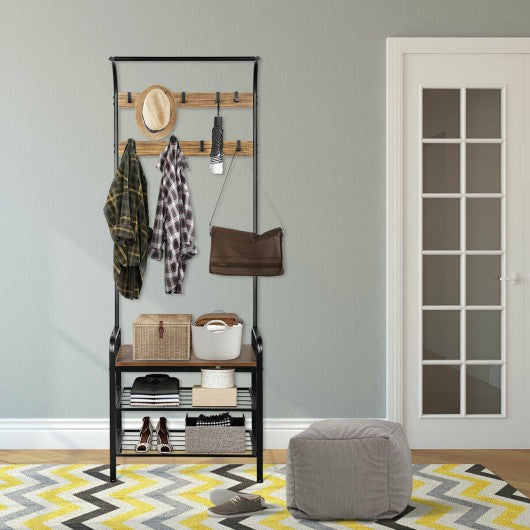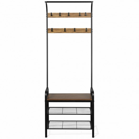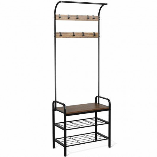Are you still struggling to find a place for your coats and shoes?   Or are you still having nowhere to sit when changing shoes? This multifunctional hall tree will provide you with the perfect solution!Made of high quality MDF and sturdy metal frame this coat rack is stable and durable. After a whole day's work and returning home you can hang your coat hat and scarf on 9 hooks sit on the bench to take off your shoes and put them on the storage shelves. Its minimalist design can blend into any home decoration suitable for entryway bedroom hallway and many other places. Combining aesthetics and practicality this coat rack can�t be missed!   If you are looking for such product don't hesitate to buy it now!   Made of durable iron frame and premium MDF for long-lasting durability A perfect combo of hanging rod coat rack and 3-tier shoe bench Equipped with 9 hooks to hang your hats coats jackets and more Compact design provides huge storage space without taking up too much space Powder coated metal frame for easy cleaning  Leveling legs increase stability and protect the floor from being scratched Suitable for bedroom entryway hallway and other places Easy to assemble with detailed instructions