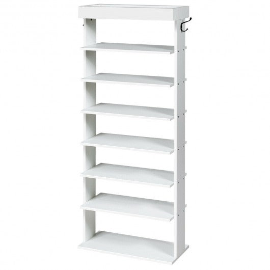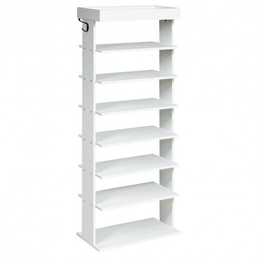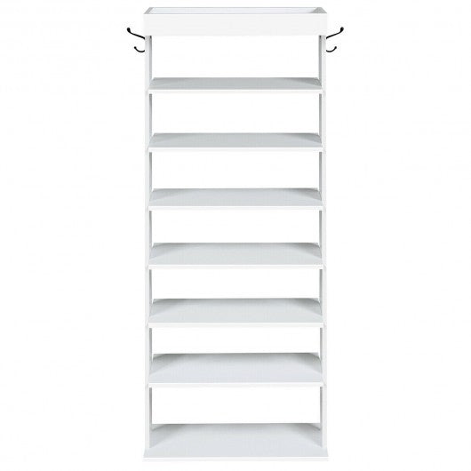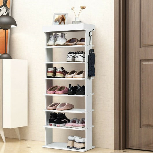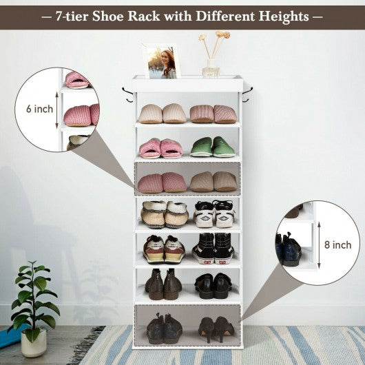 7-Tier Vertical Design Wooden Shoe Storage Shelf with Hooks-White