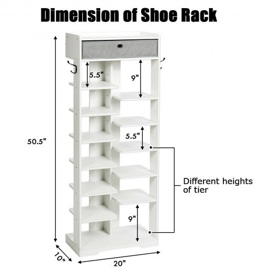 This free-standing shoe rack with staggered tiers is a perfect solution to store your different shoes in your entryway or bedroom. Each shelf is made of premium density board to provide a sturdy place to organize your shoes.   The left side has 7 tiers and the right side has 6 tiers for sneakers dress shoes sandals and slippers whatever of high or flat heels to keep your shoes tidy. Comes with a fabric drawer it can be used to store essentials for convenient taking. And the top shelf and hooks on the side of rack will provide you additional storage space for your small items. With concise appearance the shoe rack can be placed in living room or bedroom to display some small items. The shoe rack will add a warm and comfortable touch to your home.   Multiple staggered tiers for 13 pairs of shoes Two tiers on the right side are little higher than others Top shelf with raised edge for displaying decors Two hooks on the side for hanging keys and umbrellas Removable fabric drawer with a hole for easy opening Durable and sturdy frame for long time use Scratch-resistant and waterproof surface of shoe rack Round corner of top prevents bump or hurt Chic and simple design suitable for hallway and bedroom Easy to assemble by yourself according to instructions