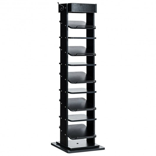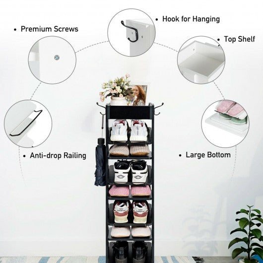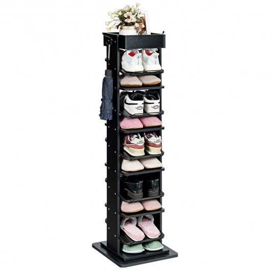 This rotatable shoe rack with 9 tiers is a perfect solution to store your different shoes together in your room or vestibule. Designed with flat and sloping boards the shoe rack is perfect to store sneaker dress shoes and slippers to keep your shoes tidy. And the anti-drop railing can prevent falling of shoes from sloping tier. In addition the shoe rack can be rotated to choose your favorite shoes. The top shelf and hooks on the side of rack will provide you additional storage space for your small items. With concise appearance the shoe rack can be placed in living room or bedroom to display some books and magazines. The shoe rack will add a warm and comfortable touch to your home. Don't hesitate ti buy it! Nine tiers include flat and sloping shelves Sloping tier is equipped with anti-sloping railing Durable and sturdy construction for long time use Top shelf creates additional space for sundries Large bottom board ensure stability of rack Two hooks on both sides for hanging Choose your shoes with rotatable design Convenient to clean with scratch-resistant surface Easy to assemble with instructions