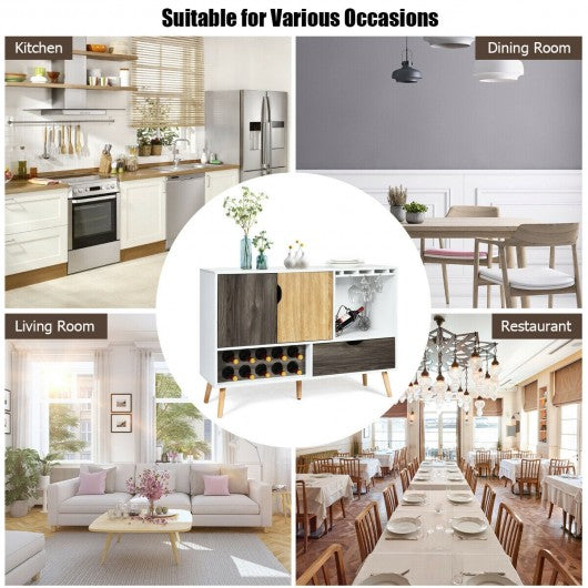 This cupboard features various storage spaces to fully meet your requirements. A storage cabinet with 3-position adjustable shelf can store various kitchen utensils of different heights. Wine racks with 3" diameter and wine glass holders satisfy the storage needs of wine lovers. And it is equipped with a large drawer and an open shelf to provide extra space for other supplies. What's more 5 sturdy pine legs give strong support and good stability. With exquisite workmanship and modern style the sideboard is suitable for kitchen living room bar restaurant and so on. Are you still bothered by the mess in the kitchen? Our buffet sideboard is a good organizer to make the kitchen tidy and orderly. If you are looking for this product do't hesitate to place an order. Made of engineered wood to ensure sturdiness and durability 5 solid pine legs for improved stability Wine rack to store 10 wine bottles with 3" diameter Wine glass holder to hang wine glasses Left cabinet with 3-position adjustable shelf for more convenience Large drawer to store silverware and glassware for safe storage Max weight capacity can reach 110 lbs Modern and elegant style to integrate into any decoration Suitable for kitchen dining room office etc Smooth surface for easy cleaning Easy to assemble under the detailed instruction
