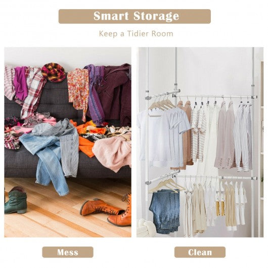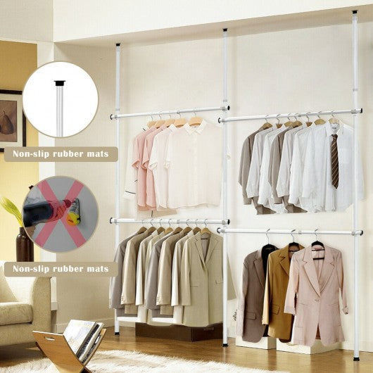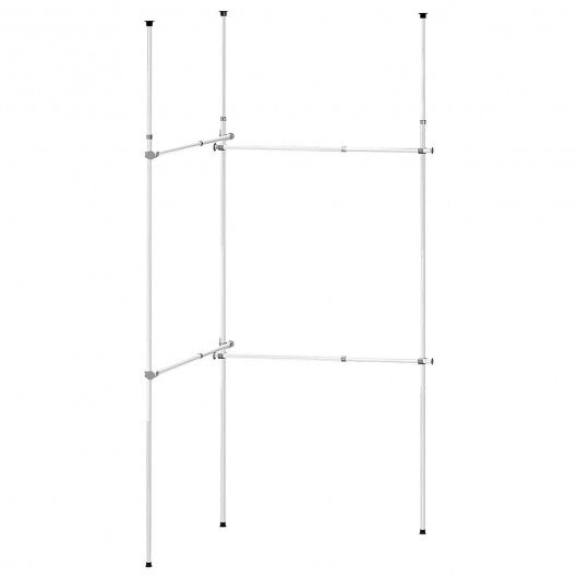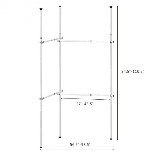 The garment rack can be adjusted both vertically (94.5"-110.5") and horizontally (56.5"-93.5") with inside spring to suit different room sizes.   The closet hanger rod can be installed simply between floor and ceiling without drilling holes on the wall. You can also choose to install it on a flat wall or corner. And multiple rods create ample storage space for hanging various clothes scarves etc. Non-slip rubber mats on the top and bottom guarantee the stability with high load capacity and keep the rack stable. Moreover its unique and space-saving design can save a lot floor space with a small footprint for enhancing the space utilization.   Our telescopic clothes rack is a really good organization helper for your limited room! Don't miss it!   Solid iron structure is sturdier and stronger for longer use Multiple rods for displaying or storing more clothes  Compact and space-saving design to be simply placed in any corner or spaces Modern appearance makes it an attractive decorative in more occasions Use widely in living room bathroom balcony Easy to set up with no tools Adjustable height and width with inner spring for different room Non-slip rubber pads on the top and bottom for stability Assemble on a flat wall or corner as you like Provide a more organized room 4 horizontal poles are provided create more storage space Suitable for various floor and walls