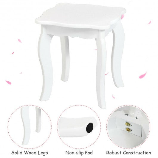 Made of premium density board the whole vanity set is very sturdy and can be used for long time. The vanity set has been tested from EPA and the paint we choose is lead-free and has no peculiar smell. Comes with a tri-folding mirror your little one can adjust the angle of mirror conveniently to get much light and make up better. The dresser also has a drawer to help store small items such as hair ties brushes makeup nail polish and other fun trinkets. In addition the mirror can be removed and the table is also can be used for writing or reading. Designed in pretty and cute appearance the vanity set will add a touch of elegance to your child's room. This kid vanity set is a perfect present for your little girl. Order it for her! Made of premium MDF for firmness and durability Heavy-duty pine legs for high load-bearing capacity Large drawer helps for storing hair ties brushes nail polish and other fun trinkets Equipped with anti-slip pads to enhance stability and prevent scratching the floor Tri-folding mirror for dressing and makeup from multiple angles With a detachable top to be a writing or reading desk Easy to assemble with detailed instructions and complete accessories Ideal to be placed in kids' bedroom and playroom The table can be secured to the wall to prevent tipping