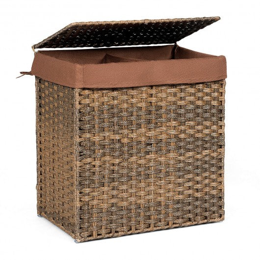 Meticulously crafted this beautiful hand-woven synthetic rattan laundry hamper with a large divided removable liner bag is an ideal choice for you to put away your dirty clothes and keep your home in perfect order. Made of stable iron frame and premium PE rattan this laundry basket ensures strong stability and can be used for a long time. Besides the waterproof synthetic rattan makes it an ideal companion for even damp bathrooms. The foldable design saves a lot of storage space and makes it easy to move. Besides for storing dirty clothes the basket can also be used to store kid's toys and other items. It's really versatile and will be a good choice for you. If you are looking for basket like that don't hesitate to buy it. Stable iron frame and tough PE rattan provide strong durability Foldable design for easy storage and space saving when not in use Divided inner space to place and store different clothes Removable liner bag makes it easy to move dirty clothes to the washer Waterproof laundry basket and easy to clean Perfect for bedroom laundry room balcony closet and bathroom Easy-to-hold handles lift-up lid and silica gel feet No assembly required