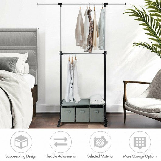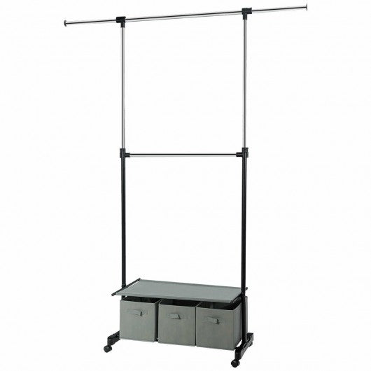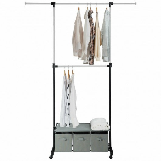 Made of heavy-duty iron frame the durable garment rack with 2 hanging rods features a functional design to orderly store clothes and provides a more organized space. This garment rack with special free standing design adjustable height and width and moveable wheels makes it suitable for many occasions ideal for bedroom dressing room and other necessary occasions to safe-keep the clothes. Thanks to the 3 additional storage boxes at the bottom it offers more storage space for your shoes towels folded clothes. Wanna keeps your daily accessories well-organized! Then oreder it now! Solid metal structure is sturdier and stronger for longer use 2 hanging rods design for displaying or storing more clothes Hang up garment conveniently on the rack Prevent clothes from falling off with functional stoppers on each side Compact and space-saving design to be simply placed in any corner or spaces Modern appearance makes it an attractive decorative in more occasions Used in living room bathroom balcony etc 3 clothing storage box drawers for conveniently storing small clothes 4 smooth wheels provide free movement between 2 locations Adjustable height and extensible top rod offer customizable size Easy to install and clean
