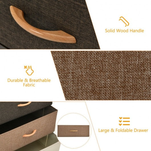 This dresser storage tower with 5 foldable drawers will organize your items in good order to maximize your space and make your room tidy. High-grade fabric drawers can keep things in good condition and are more durable. Modern style allows the dresser to blend with any home decor easily. It is perfect for bedroom nursery room laundry room living room hallway closets etc. As for the quality this cabinet is made of sturdy steel frame and durable MDF top ensuring strong stability and long-lasting use. And the wooden top is smooth and waterproof for easy cleaning. Featuring a lightweight and compact design this 5-drawer dresser chest stand is portable easy to move and assemble. If you are looking for a cabinet like it do not hesitate to place the order! 5 large capacity drawers hold your various items in good order Heavy-duty steel frame ensures great sturdiness and stability The foldable and removable drawer is made of high quality fabric Premium MDF top is scratch-resistant waterproof and easy to clean Adjustable foot pads enhance overall stability and protect the floor Compact lightweight and space-saving design ensure versatility Round handles on both sides of the dresser make it easy to move Anti-drop plate on the back avoids the drawer from being pushed out Solid wood handles greatly facilitate your access to the objects Anti-toppling device and round corner design ensure high safety Modern design makes this dresser a great decoration to your home Ideal for living room bedroom nursery room entryway and more Easy to assemble with detailed instruction