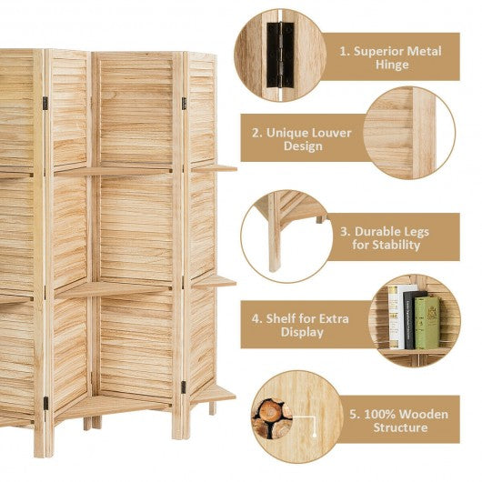 4 Panel Folding Room Divider Screen with 3 Display Shelves-Brown