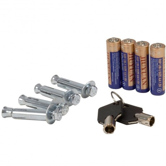 Specification: Color: Black Material: Solid steel Operation: Digital pin or override key Original code: 159 then press A or B Overall dimensions: 13.8" x 11.8" x 19.7" Weight: 37 lbs Interior dimensions: 13.5" x 11" x 19.5" Door opening: 12.5" x 17.5" Body thickness: 2 mm solid steel Door thickness: 4 mm solid steel Battery required: 4 x AA-size 1.5 V Time out period: After 3 wrong entries Package includes: 1 x safe box 2 x keys (please do not keep emergency key in the safe) 4 x pieces of 1/4" anchor bolts for mounting 4 x AA-size 1.5 V battery 1 x velvet cushion 1 x instruction manual Caution: Please take out the emergency key and keep it in a safe place. Please read the instruction thoroughly before using the unit. Please keep this manual for future reference.