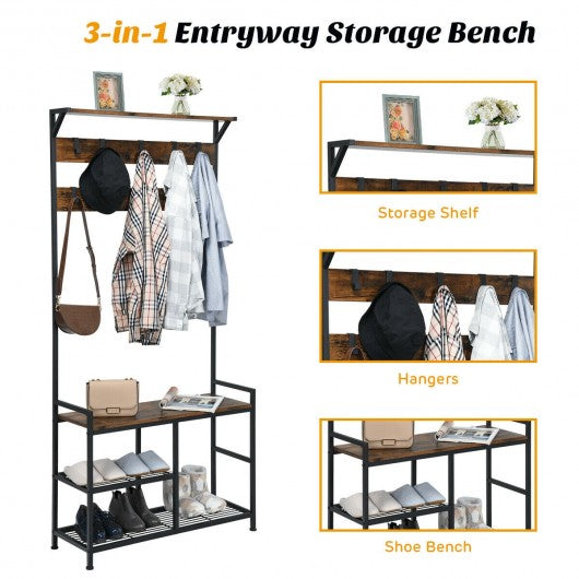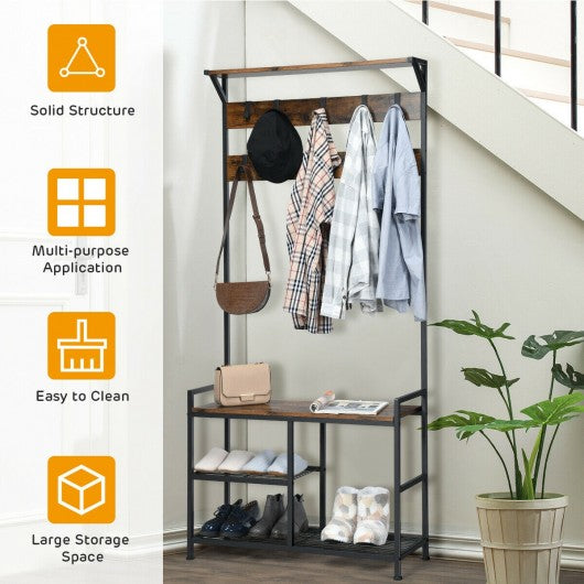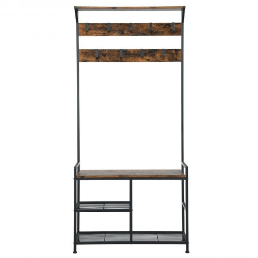 Are you bothered by your messy entryway? This hallstand can keep your entrance in order.   The 3-in-1 entryway coat rack with shoe bench is made of high quality metal tube and engineered wood that enjoys stable and firm structure for durable use. It owns nine flexible hooks for you to hang your coats scarves and hats on it. The bottom shoe bench with three shoe racks could meets more storage requirements in daily life. It is ideal for keeping shoes and boots clean and orderly. Broad mesa and appropriate height provide you with a convenient and strong seat when you wear or take off your shoes.   Provide a storage space for your entrance passage or corridor.Don't hesitate to buy it!   3-In-1 multifunctional coat rack for large storage space Storage and organize daily clothes for your convenience Made of metal tube and engineered wood for steadiness and stability Equip with adjustable pads to keep balance and avoid scratching the floor With 9 flexible metal hooks it is convenient to hang clothes and hats Multilevel coat rack for ample storage space and tidy room Protective anti-falling rope gives great protection The design of benches makes it easier for you to wear shoes Industrial and vintage style suits for hallway bedroom office