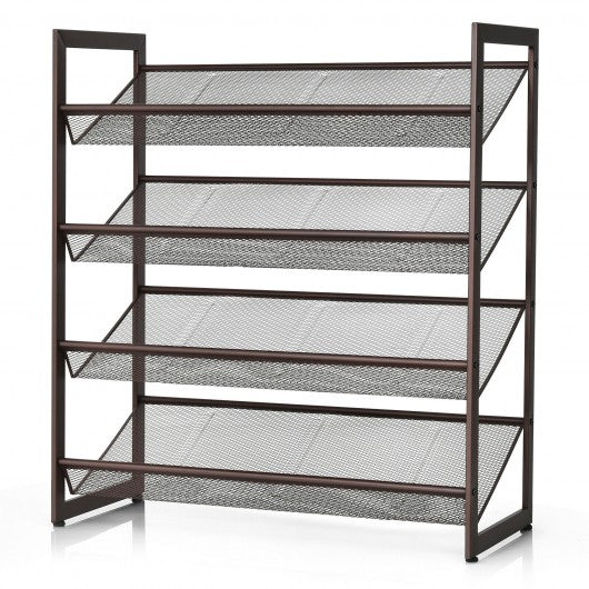 Keep your shoes organized and off the floor with our 4-tier shoe storage rack! The nicest thing about this shore storage organizer is that shelves can be installed angled or flat or even better a mixture of both not to mention it is easy to assemble and adjust. Mesh shelves are great for airflow and friendly to high heels and stilettos. Containing 4 layers and yet still compact enough to fit into your closet and other narrowed areas this shoe storage shelf can accommodate at least 16 pairs of shoes. The steel frame makes sure this neat shoe organizer is stable and durable in use. If you are looking for a shoe organizer stand like this do not hesitate to place an order! The shelves can be installed angled or flat based on your preference Several layers for maximizing shoe storage needs of slippers sneakers and so on Mesh shelf design is breathable and stuck-free even for high heels Compact shoe storage unit is suitable for small areas Contain at least 16 pairs of shoes Easy to assemble with detailed instruction Ideal for living room hallways foyer Multiple optional layers available in our store Load-bearing of each shelf is 11 lbs Simplicity inspired with aesthetic pleasing